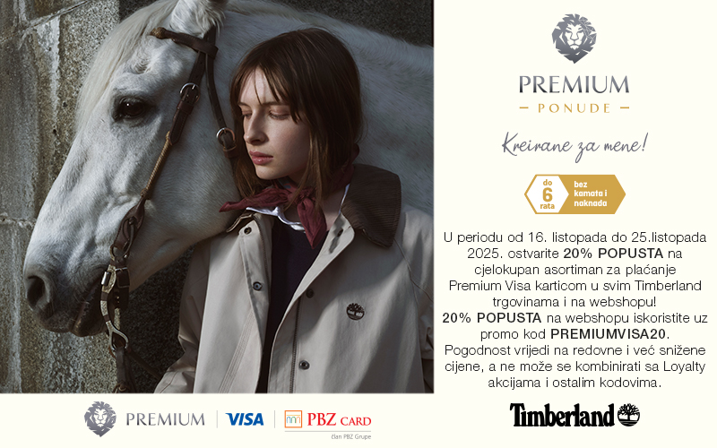 U periodu od 16. do 25. listopada 2025. ostvarite 20% popusta na cjelokupan asortiman za plaćanje Premium Visa karticom u svim našim Timberland trgovinama i na webshopu!